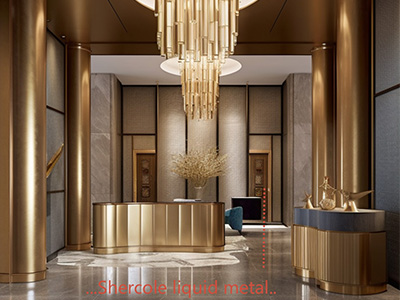 液態(tài)金屬能應(yīng)用到酒店哪方面裝飾?液態(tài)金屬可以用于大堂的裝飾元素,如立柱、墻面、天花板等,為酒店營造...