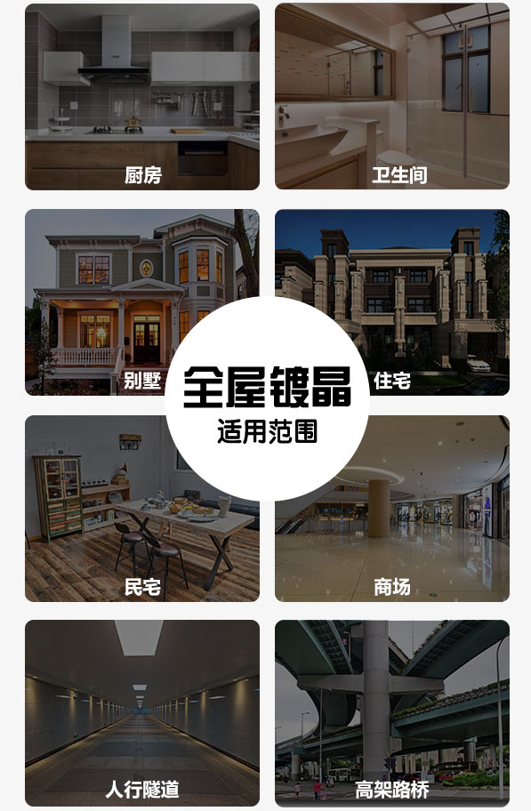 除了以上多種優(yōu)點(diǎn)之外,全屋鍍晶于多種材質(zhì)表面保護(hù),如:各種漆面、金屬、石材、陶瓷、水泥板、合成板、塑膠板、PVC、磚瓦、鋼結(jié)構(gòu)、不銹鋼、鋁材、混凝土、木材、軟瓷、玻璃等材質(zhì)表面,適用于廚房、衛(wèi)生間、別墅外墻、高檔建筑物外墻、涼亭、護(hù)欄、高鐵、飛機(jī)、軍艦、戰(zhàn)斗機(jī)等場(chǎng)所和物體的防護(hù)。具有極佳的戶外耐候能力,延長(zhǎng)被保護(hù)物體的使用壽命。
