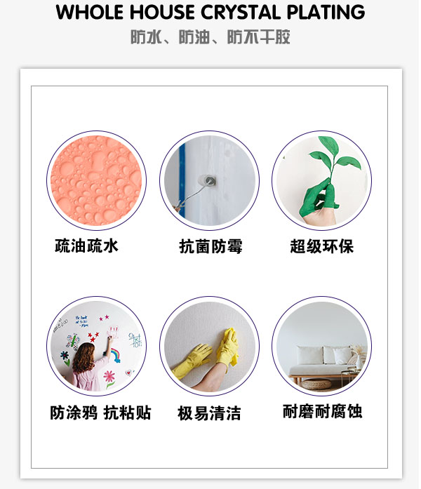 全屋鍍晶膜由我司教授和博士團(tuán)隊(duì)采用最新的納米級(jí)硅分形組合技術(shù)研發(fā)而成,具有超強(qiáng)疏水疏油特性和自潔效果的功能涂層,水性筆、油性筆、油污、不干膠甚至手噴漆等污漬都很難在上面附著,極易清潔,適用于乳膠漆墻面、壁布、硅藻泥、藝術(shù)涂料、大理石、集成墻板等多種材質(zhì)。