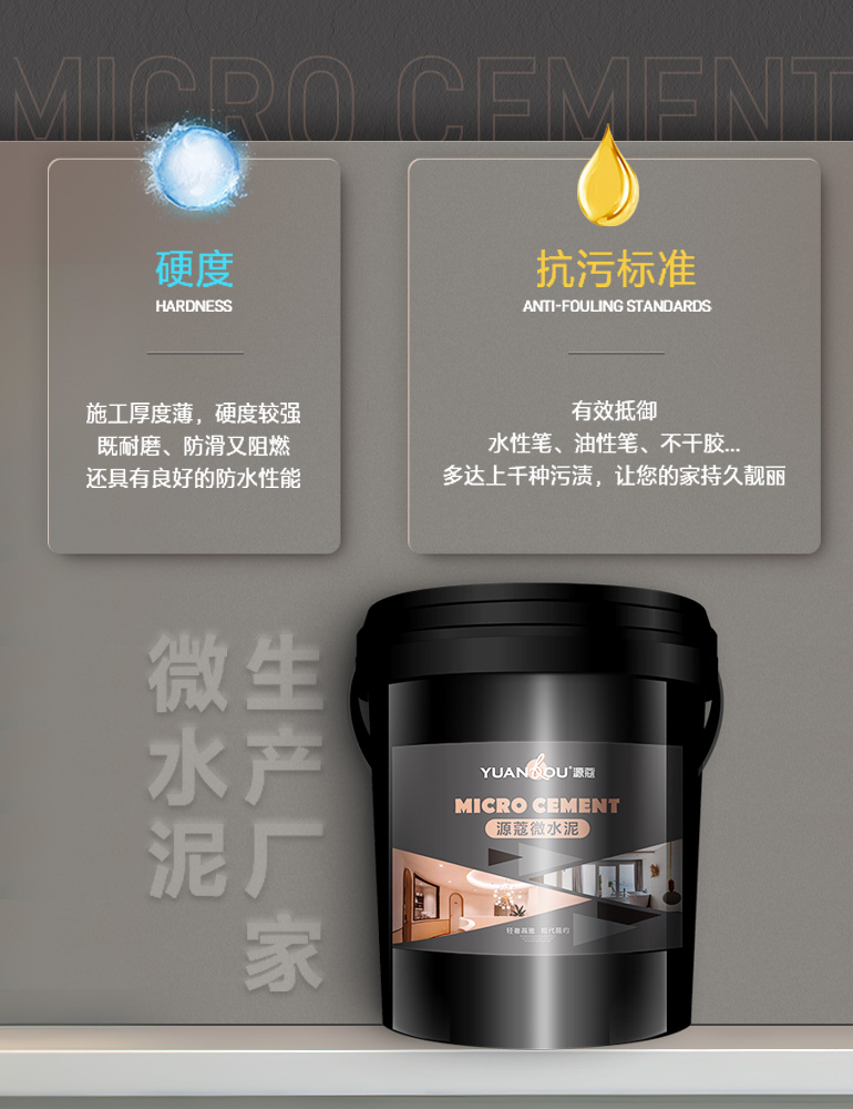 微水泥系列(又名納米水泥/清水混泥土)作為新一代表面裝飾材料,具有強度高、厚度薄、無縫施工防水性強等特點,主要成分是水泥、水性樹脂、改性聚合物、石英等材料。 產(chǎn)品還配套由源蔻自主研發(fā)的納米級硅分形組合材料-鍍晶涂層,可直接刷到微水泥表面,在保護物表面形成高硬度的空氣保護層,讓油性記號筆、不干膠甚至手噴漆等污垢無法在表面附著,只需清水即可清洗,使之保持高清潔度。